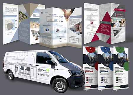 - Izstāžu stendu, roll-up banneru un citu prezentācijas materiālu dizains;